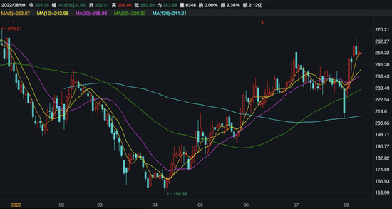 业绩快报披露后的头个交易日,古井贡酒便以涨停价234.67元/股(不复权,下同)收盘,次日涨幅又达6.53%。截至8月8日,股价收盘于255元/股,仍处今年以来高位区域。