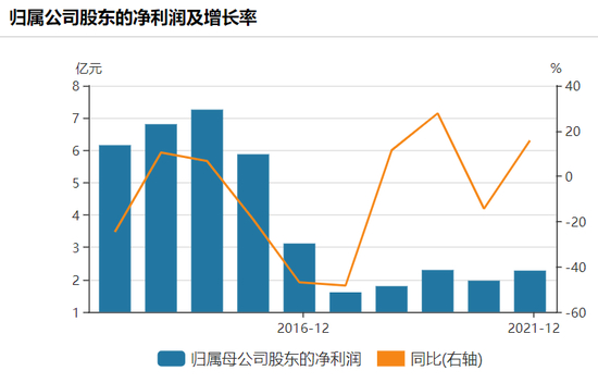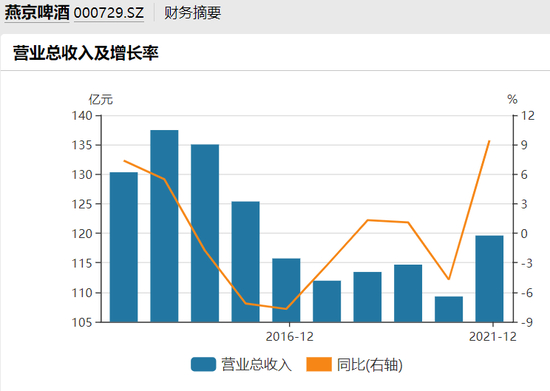 2019年至2021年,燕京啤酒营收分别为114.68亿元、109.3亿元、119.6亿元;归母净利润分别为2.3亿元、1.97亿元、2.3亿元。