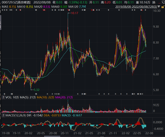 但在二级市场,其股价表现却一直不温不火。早在2020年年末,燕京啤酒股价就达到10元/股,但此后股价一直在6~10元间波动起伏,很难超过2020年末的水平。截至今年8月8日收盘,该股报8.08元/股,市值227亿元,滚动市盈率67倍。