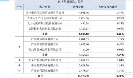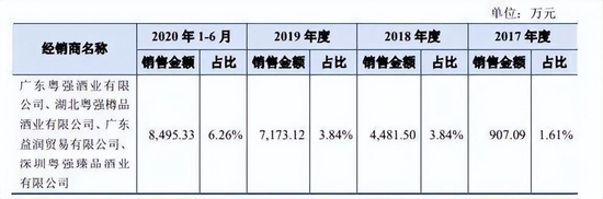 招股书显示,国台酒业2019年度前五大经销商中,除了第一名是控股股东天士力旗下公司,其余的皆是各地大商。位居经销商第二名的广东粤强酒业及其关联公司,2017-2019年销售金额分别为907.09万元、4481.5万元、7173.12万元,分别占当期营业收入的1.61%、3.84%、3.84%。