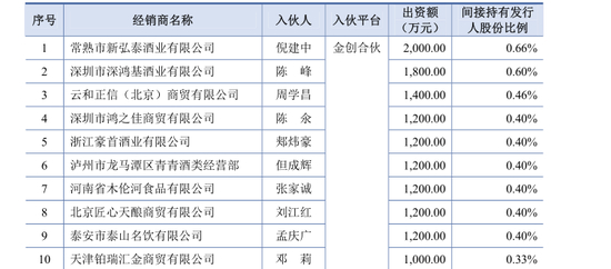 值得关注的是,广东粤强间接持有国台酒业超过1%的股份。与广东粤强酒业同时间接持有国台酒业股份的经销商还有102家,他们基本上都是以共创合伙、合创合伙和金创合伙的入伙人形式间接持有国台酒业股份。