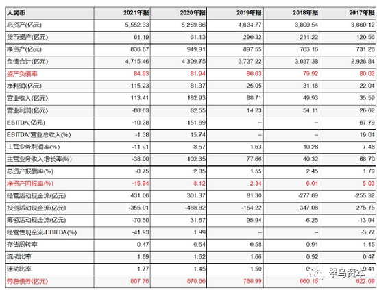 我们梳理了钜盛华2017年-2021年的基本面数据,可以看出其资产负债率持续攀升,截至2021年末高居至接近85%的水平上,负债合计高达4715亿元。