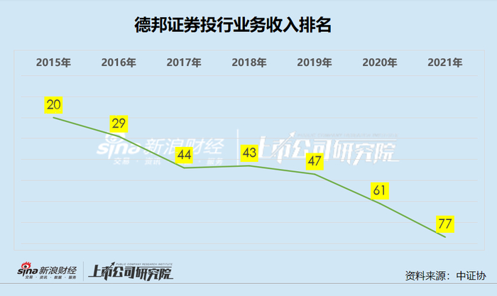 德邦证券的投行业务也出现大滑坡。中注协公开的数据显示,德邦证券2015-2021年的投行收入分别为 7.99亿元、6.36亿元、3.21亿元、1.69亿元、2.41亿元、1.81亿元、0.82亿元; 在行业内的排名分别为第20名、第29名、第44名、第43名、第47名、第61名、第77名,由中上游投行沦为中下游投行。