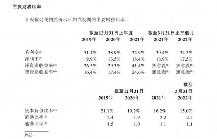港股招股书显示,2019年、2020年、2021年3月末及2022年3月末,毛利率分别为51.1%、38.9%、32.9%、39.4%及34.3%。不过同期来看,其净利率由2019年末的9.9%升至2022年3月末的17.5%。