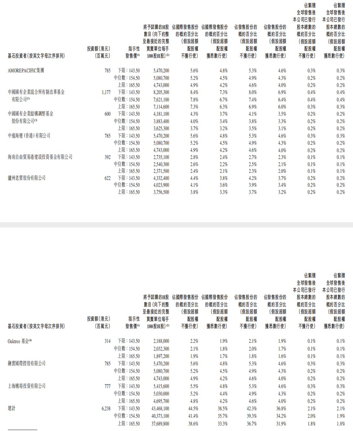 根据公告,中国中免本次上市引入9名基石投资人,累计认购62.38亿港元股份(占本次发行规模的38.4%),包括中国国有企业混合所有制改革基金、中国国有企业结构调整基金、中远集团旗下中远海运(香港)、韩国爱茉莉集团、海南自贸港建设投资基金、泸州老窖、Oaktree基金、上海机场、融宝国际控股,投资额分别为11.77亿港元、6亿港元、7.85亿港元、7.85亿港元、3.92亿港元、6.22亿港元、3.14亿港元、7.77亿港元和7.85亿港元。