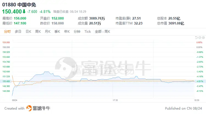富途证券显示,8月24日下午16时30分,中国中免暗盘以152港元开盘,开盘即破发,跌幅达6.84%,报147.2港元/股,随后跌幅有所缩窄,截至当日18时30分,报收150.4港元/股,跌幅4.81%,成交量20.51万股。