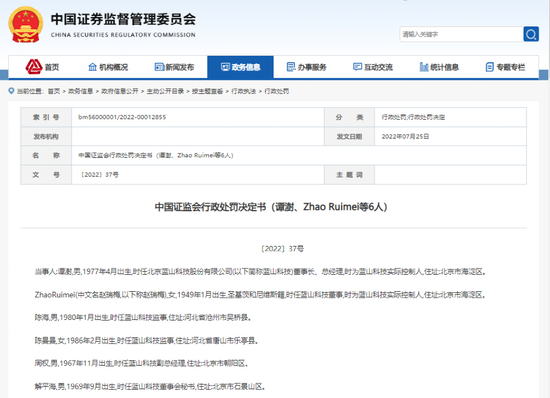 行政处罚决定书显示,蓝山科技时任董事长兼总经理谭澍、时任董事赵瑞梅组织、策划、指使、实施了虚增银行存款、虚增销售收入、虚构研发支出、虚构处置出售资产等财务舞弊行为。