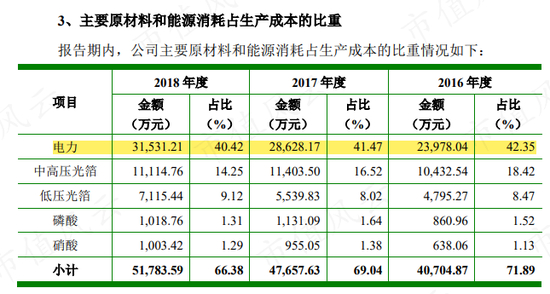 在2016~2018年间(招股说明书报告期间),公司所生产的中高压化成箔,平均每平方米需要使用73度电,低压化成箔每平方米也需要约10度电,可见中高压产品的耗电量远高于低压产品。