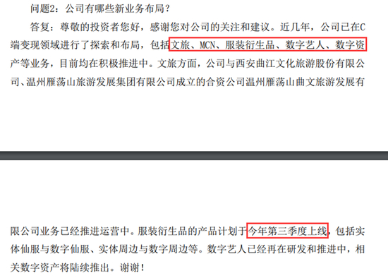 在今年6月欢瑞世纪举办2021年度业绩说明会上,副总经理陈亚东表示,公司结合自身业务优势,在数字艺人、数字衍生等方向积极构建和布局。服装衍生品的产品计划于今年第三季度上线,包括实体仙服与数字仙服、实体周边与数字周边等。数字艺人已经在研发和推进中,相关数字资产将陆续推出。
