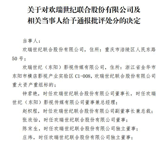 今年1月13日,深交所又对欢瑞世纪和时任董事长兼总经理钟君艳等一众时任高管进行了通报批评处分,理由是公司重组文件和财务报告虚假记载,未充分披露关联方资金占用的关联交易。