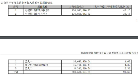 具体来看,欢瑞世纪前五大收入中,电视剧《南风知我意》《山河月明》收入表现出彩,两部剧合计实现近3亿元的营收。上半年盈利大增的背后,欢瑞世纪直言,主要系影视剧确认收入的部集数量增加所致。同时,公司艺人经纪业务收入占比骤降至11.80%。