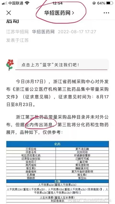 “药闻康策”在扩散和传播虚假集采政策上起到了重大作用,但真正的源头还另有其人,《每日经济新闻》记者发现,该传闻更早出现在8月17日17:27,发布者为“华招医药网”的微信公众号。