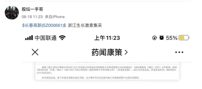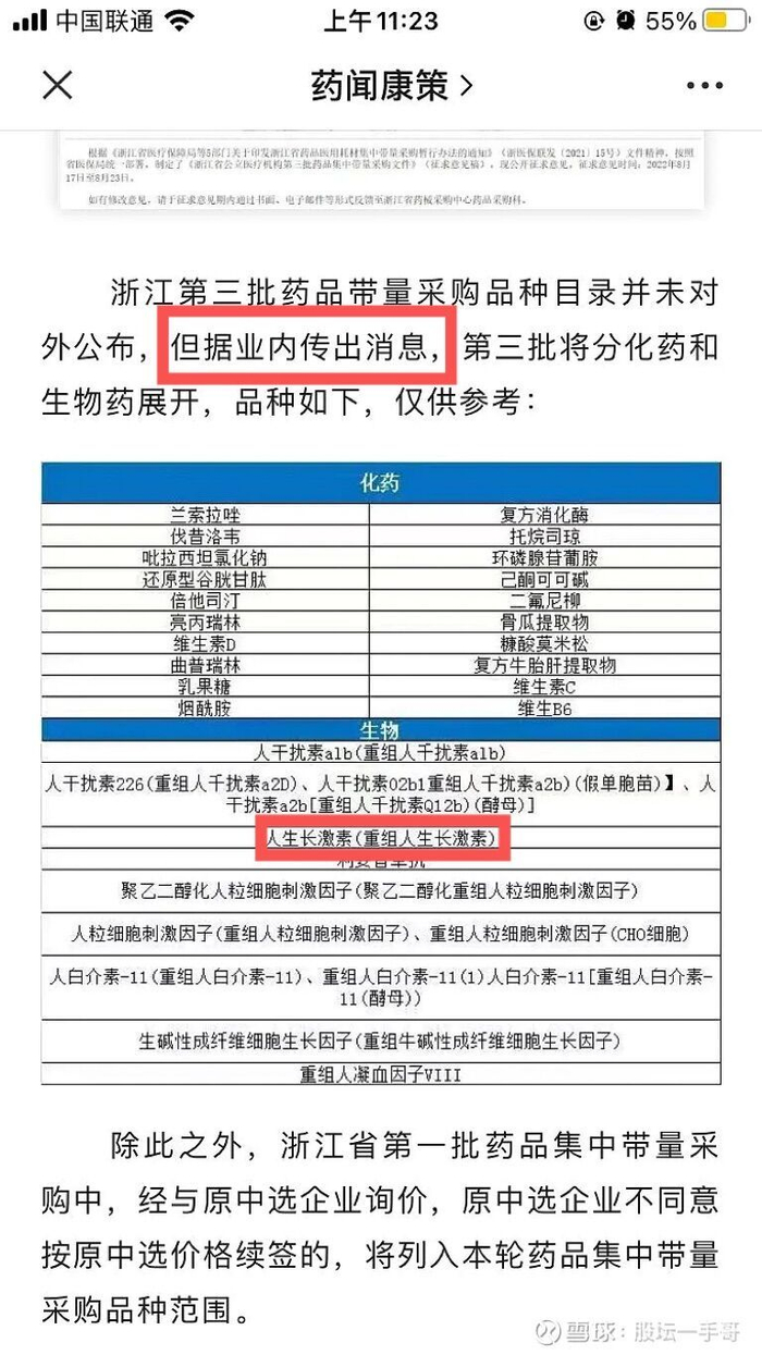 众多网友热议该传闻,特别是一张截图广为流传,这张截图被称作是浙江省第三批药品集中带量采购的品种列表,而长春高新的当家产品生长激素赫然在列。在原文中,这张表格的消息来源标注为“据业内消息”。