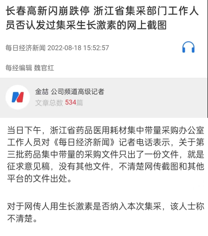 长春高新突然大跌,源于当日一则市场传闻:浙江省将集采生长激素。