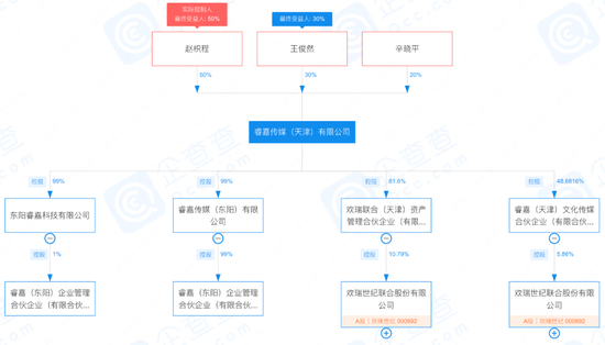 另一增持方睿嘉(东阳)企业管理合伙企业(有限合伙)成立于2022年7月末,往上追溯其控股为睿嘉传媒(天津)有限公司,该公司则为欢瑞世纪第一大股东欢瑞联合(天津)资产管理合伙企业(有限合伙)的控股股东,持股占比为81.6%。