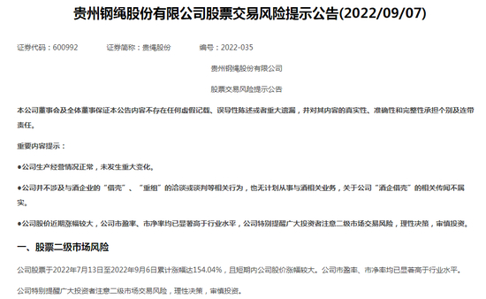9月6日晚间,贵绳股份发布交易风险提示公告称,公司并不涉及与酒企业的“借壳”、“重组”的洽谈或谈判等相关行为,也无计划从事与酒相关业务,关于公司“酒企借壳”的相关传闻不属实。