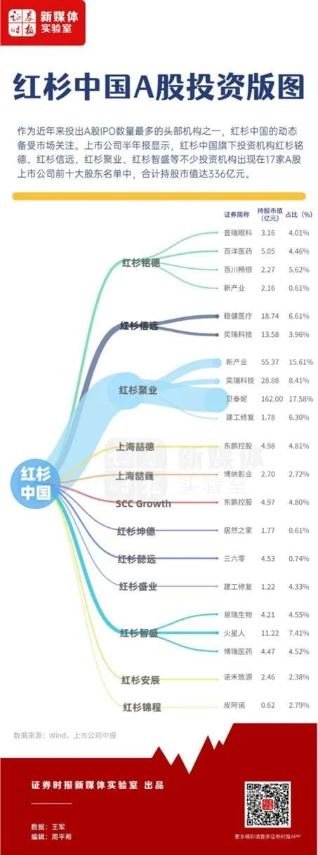 上市公司半年报显示,红杉中国旗下投资机构红杉铭德、红杉信远、红杉聚业、红杉智盛等不少投资机构出现在17家A股上市公司前十大股东名单中,合计持股市值达336亿元。