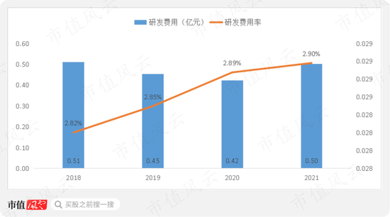 研发投入方面,近几年基本保持稳定,研发费用率整体较低。