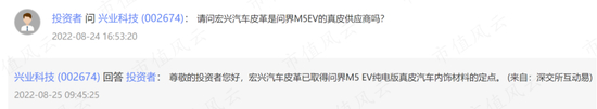 宏兴汽车皮革的控股股东兴业科技(002674.SZ),近期频获机构投资者调研。目前,宏兴汽车皮革已取得问界M5 EV纯电版真皮汽车内饰材料的定点。