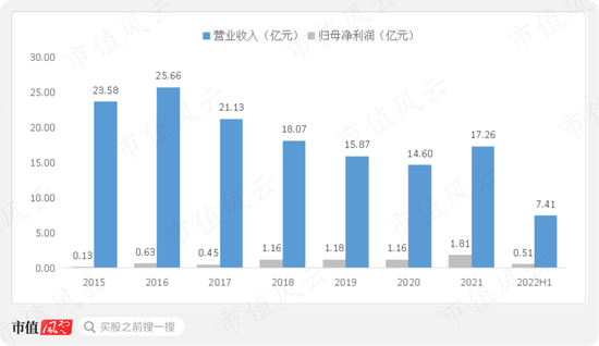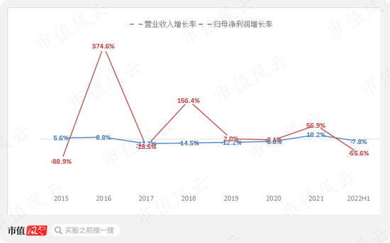 2021年营收出现增长,但增速不高,2016年、2018年和2021年归母净利润出现明显增长。2022年上半年,营收同比下滑7.8%,归母净利润同比下降55.6%。