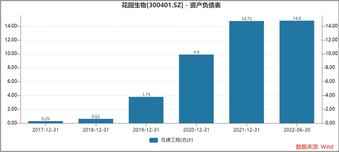 近年花园生物的在建工程不断攀升,由2019年的3.79亿元飙升至2021年的14.75亿元。截止2022年半年报报告期末,花园生物在建工程为14.75亿元,在建工程占总资产之比近40%。