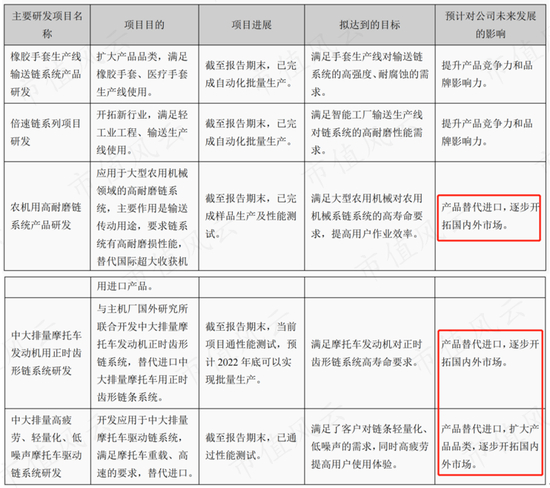此外,公司突破国内行业技术瓶颈,成功研发了用于汽车变速箱的哈瓦齿形链,是继美国、日本公司之后全球第三个研发成功的厂家,目前主要研发项目如下: