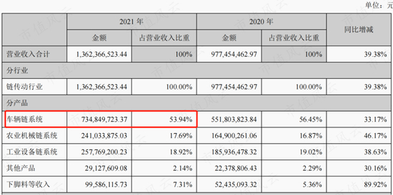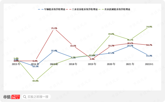 营收方面,2021年车辆链系统产品营收占比为53.94%,近几年占比均在50%以上,工业设备链系统和农机链系统收入体量相当。