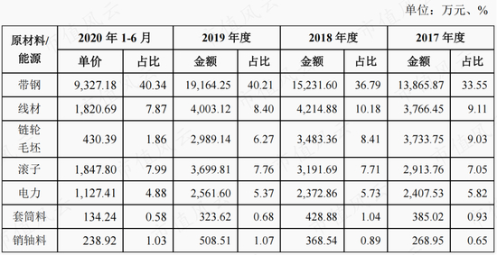 上游方面,2021年前五名供应商合计采购金额占年度采购总额比例为45.17%,集中度较高,主要原材料包括带钢、线材、销轴料、套筒料和滚子等,其中带钢占比最高。