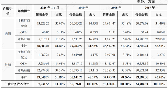近几年内销和外销模式下主机厂商配套、OEM和售后市场经销收入金额及占比情况如下: