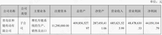 全资子公司青岛征和链传动有限公司为摩托车链的业务主体,2021年营业收入为6.85亿元,同比增长34.32%,主要原因系老产品的稳步提升及新产品的推出所致。