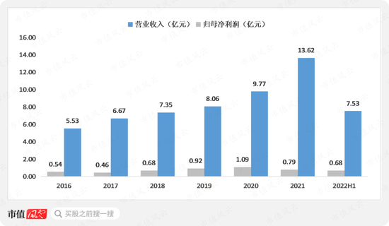 整体业绩方面,2016年以来营收基本保持增长态势,2021年增长较为明显。