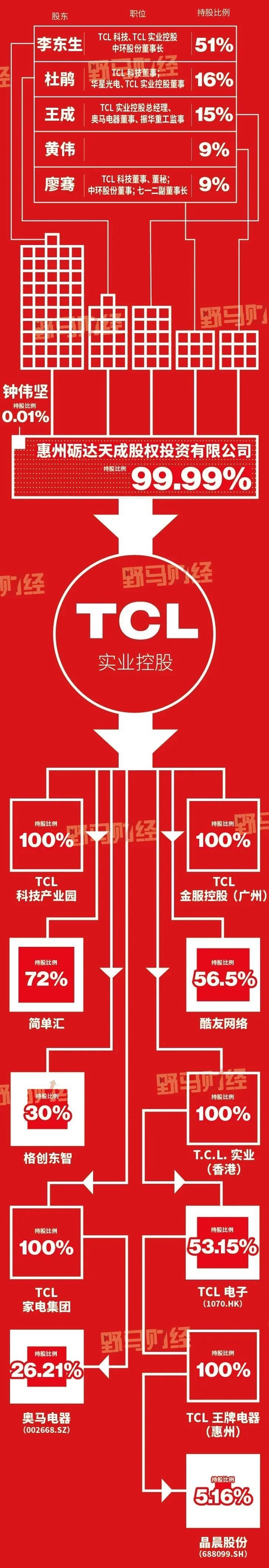 2021年,李东生曾高调拿下奥马电器控制权,截至目前已控股了包括奥马电器(002668.SZ)、TCL科技(000100.SZ)、TCL电子(1070.HK)、华显光电(0334.HK)和TCL中环(002129.SZ)五家上市公司,涉及业务广阔,包括家电制造、半导体显示、半导体材料研发、通讯等领域。