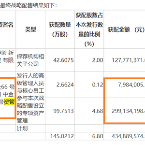其中,中金丰众66号资管计划、中金丰众67号资管计划为万润新能核心员工“打新”的通道,资管计划管理人为中金公司。两家资管计划合计配售2.8亿元的新股,上市首日账面浮亏0.77亿元。