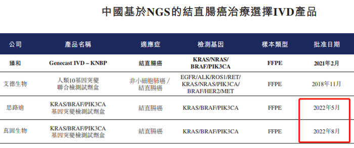 资料来源:公司招股书相比之下,臻和科技相同技术的产品覆盖的基因只有4个,不仅少于NCCN指南推荐结直肠癌患者必检KRAS/NRAS/BRAF/NTRK/HER2/MSI/MMR等7个,更远少于艾德生物的10个。且Genecast IVD-KNBP仅仅获批的结直肠癌,而NGS-10(维惠健)获批了结直肠癌和市场更大好几倍的非小细胞肺癌适应症。