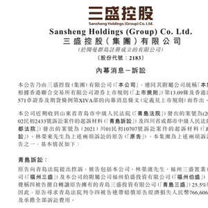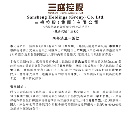 今年3月,三盛控股(02183. HK)公告,因股权转让纠纷,林荣东将三盛控股、林荣滨及相关方告上法庭,两起诉讼合计涉及赔偿金额14.05亿元。