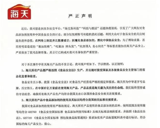 10月1日,“海天味业回应酱油添加剂争议”登上微博热搜。随后,海天味业发布《严正声明》回应称符合国家标准。