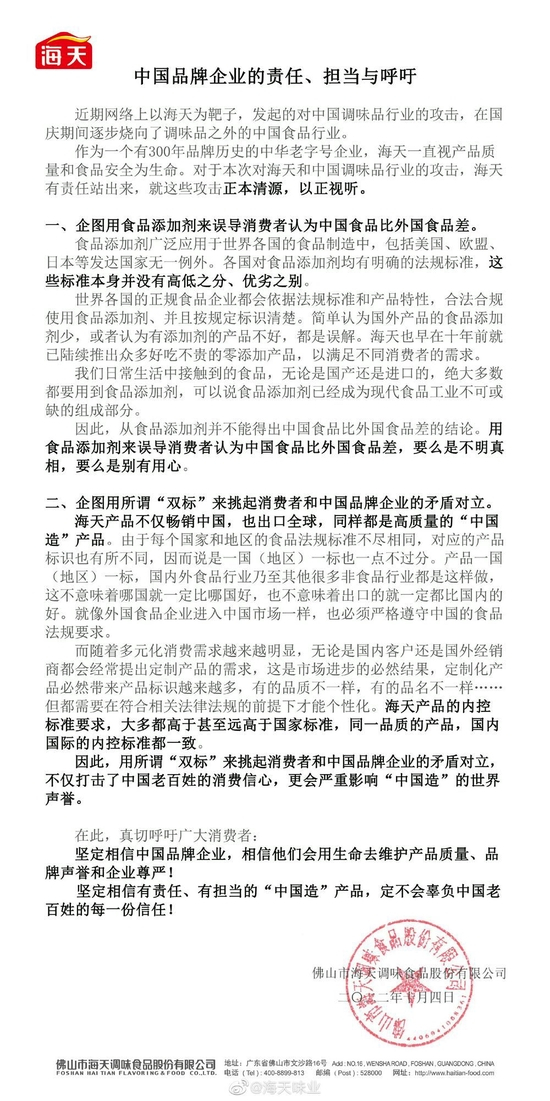 10月4日,海天味业再次发布声明,表示用食品添加剂来舞蹈消费者认为中国食品比外国食品差,要么是不明真相,要么是别有用心;而企图用“双标”来挑起矛盾对立,不仅打击了国人的消费信心,还会严重影响“中国造”的世界声誉。