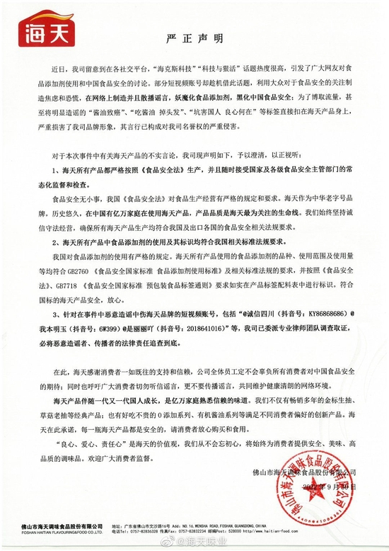 据悉,在事件发酵当晚,9月30日海天味业立即发布了一份声明。
