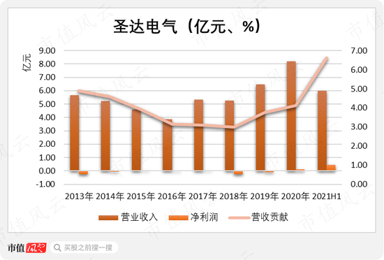 终于,2021年,圣达电气的业绩发生质的变化,上半年营收贡献达6.62%,实现净利润4,622.57万元,远高于过去各年度全年的业绩。
