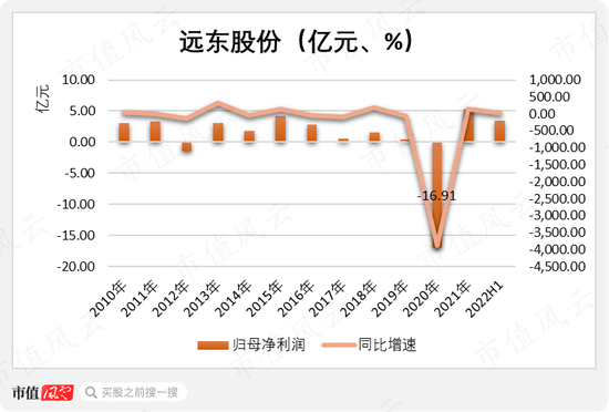 2020年,远东股份归母净利润亏损了16.91亿元。过去十年(2010-2019年),归母净利润合计之也不过19.33亿元,基本被一把亏完。