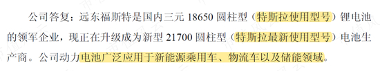 不仅如此,远东电池还蹭上“特斯拉”概念,称其18650圆柱型锂电池,以及升级的21700圆柱型电池,都是特斯拉使用型号。