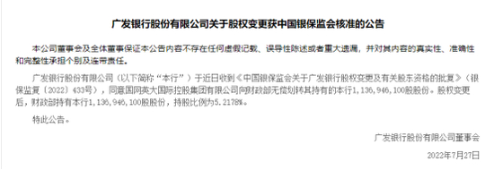 值得注意的是,此次并非年内广发银行股权首次变更。据官网显示,3个月前,国网英大(600517.SH)向财政部无偿划转其持有的广发银行11.37亿股股份。股权变更后,财政部持有广发银行5.2178%股份;国网英大持股比例由原来的15.647%变为8.919%。