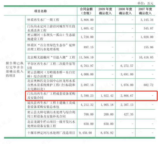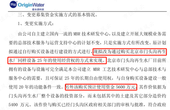 2010年4月公司上市,募集资金25.5亿元;同年11月宣布调整募投项目部分内容,原计划自行购买设备进行建设,改为购买北京市门头沟再生水厂(以下简称门头沟水厂)同样设备25年的使用经营权,交易价格为5600万元。