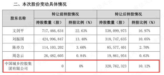 同年5月6日,3.37亿股的受让方变为中国城乡控股集团有限公司(以下简称城乡控股),交易价格31.9亿元,对应单价9.46元/股。