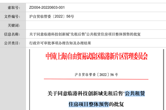 不过2022年6月1日,中国(上海)自由贸易试验区临港新片区管理委员会特别批复了临港公共租赁住房项目整体预售。