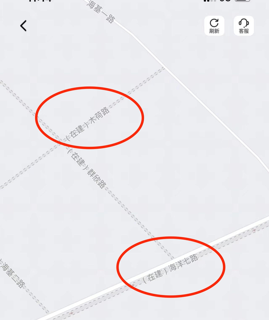 从地图上来看,海洋七路与木荷路相邻,两条路及周边部分公路显示的都是“在建”状态。