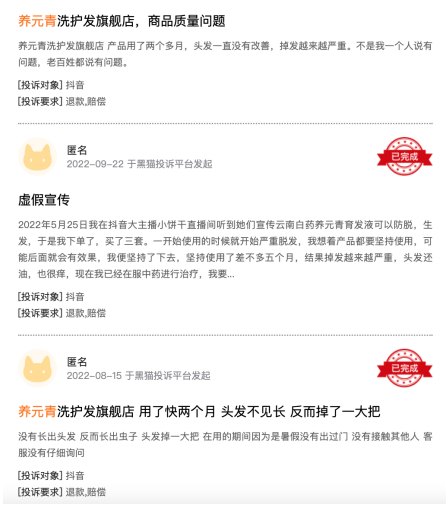 有部分消费者还在黑猫投诉上表示,“用了声称可以生发的‘养元青’后脱发越来越严重。”