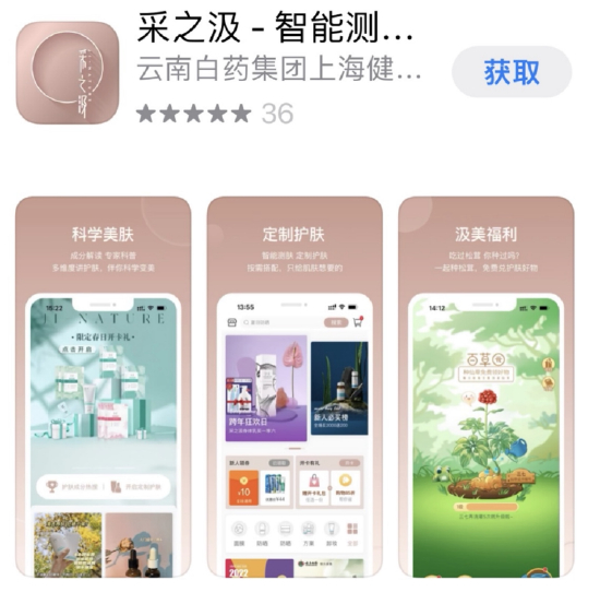 2021年上半年,云南白药在昆明开设“云南白药精准定制肌肤管理中心”、“采之汲AI私定肌肤管理中心”门店,还上线了一款“采之汲”APP。该款APP主要有两个功能,一是线上检测皮肤,二是销售云南白药的美容类产品,如面膜、防晒霜等。