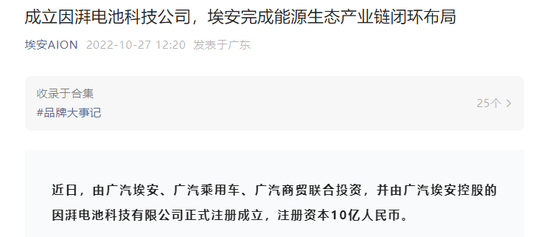 10月27日午间,广汽埃安宣布因湃电池科技有限公司正式注册成立,注册资本10亿元,该公司由广汽埃安、广汽乘用车、广汽商贸联合投资,并由广汽埃安控股,位于广州市番禺区,总投资109亿元,开展电池自研自产产业化建设以及自主电池的生产制造和销售。