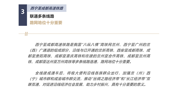 需要指出的是,铁路作为国家关键性基础设施,具有投资量大、建设项目施工周期长,用工规模大,产业链条长、促进社会经济发展作用明显等特点。对于西宁至成都高铁的全面开工建设,有机构表示,作为推动“丝绸之路经济带”和“长江经济带”互联互通的重要工程,该条铁路新线的开工建设,将为产业链上下游公司发展带来新动能。